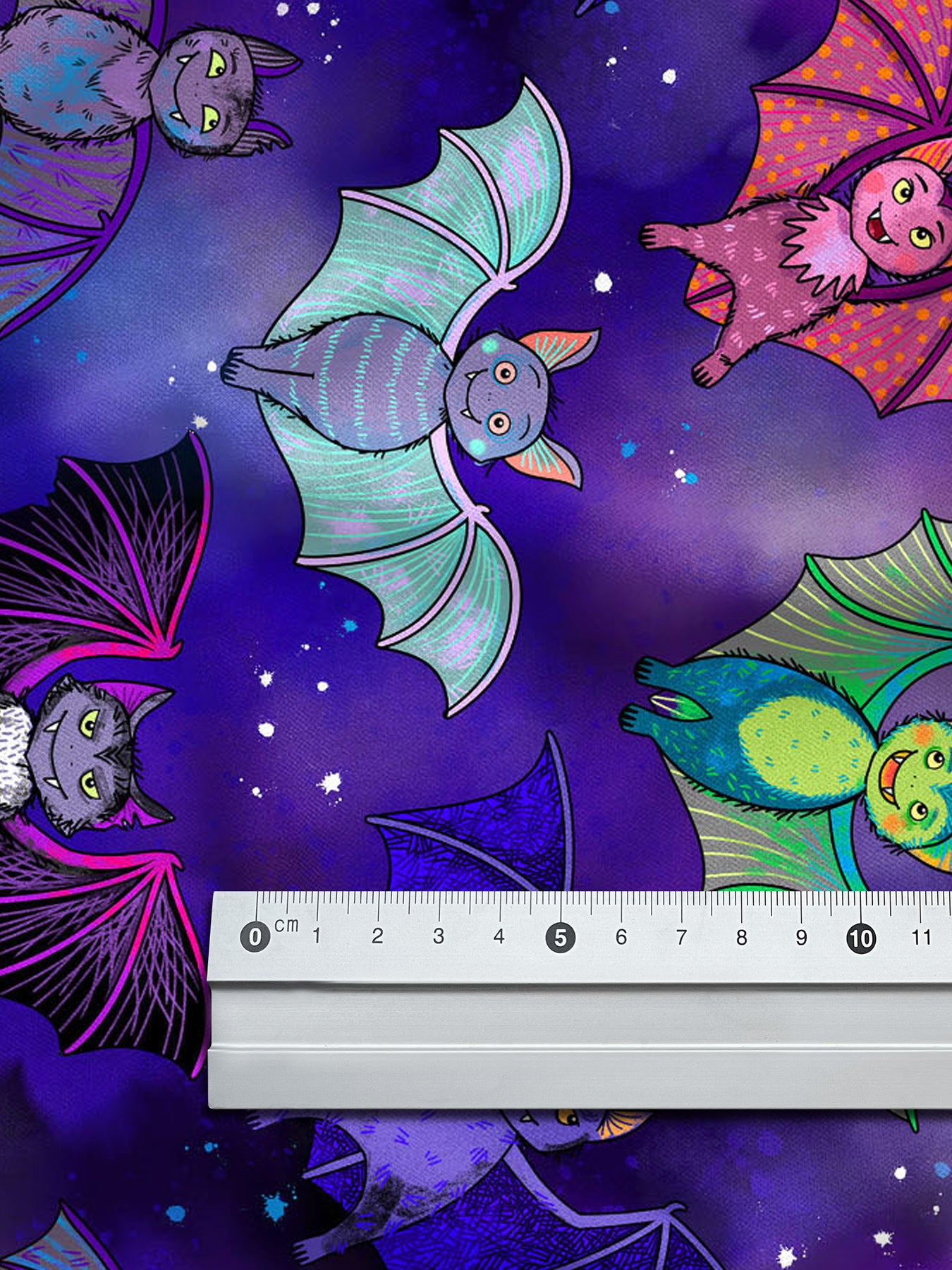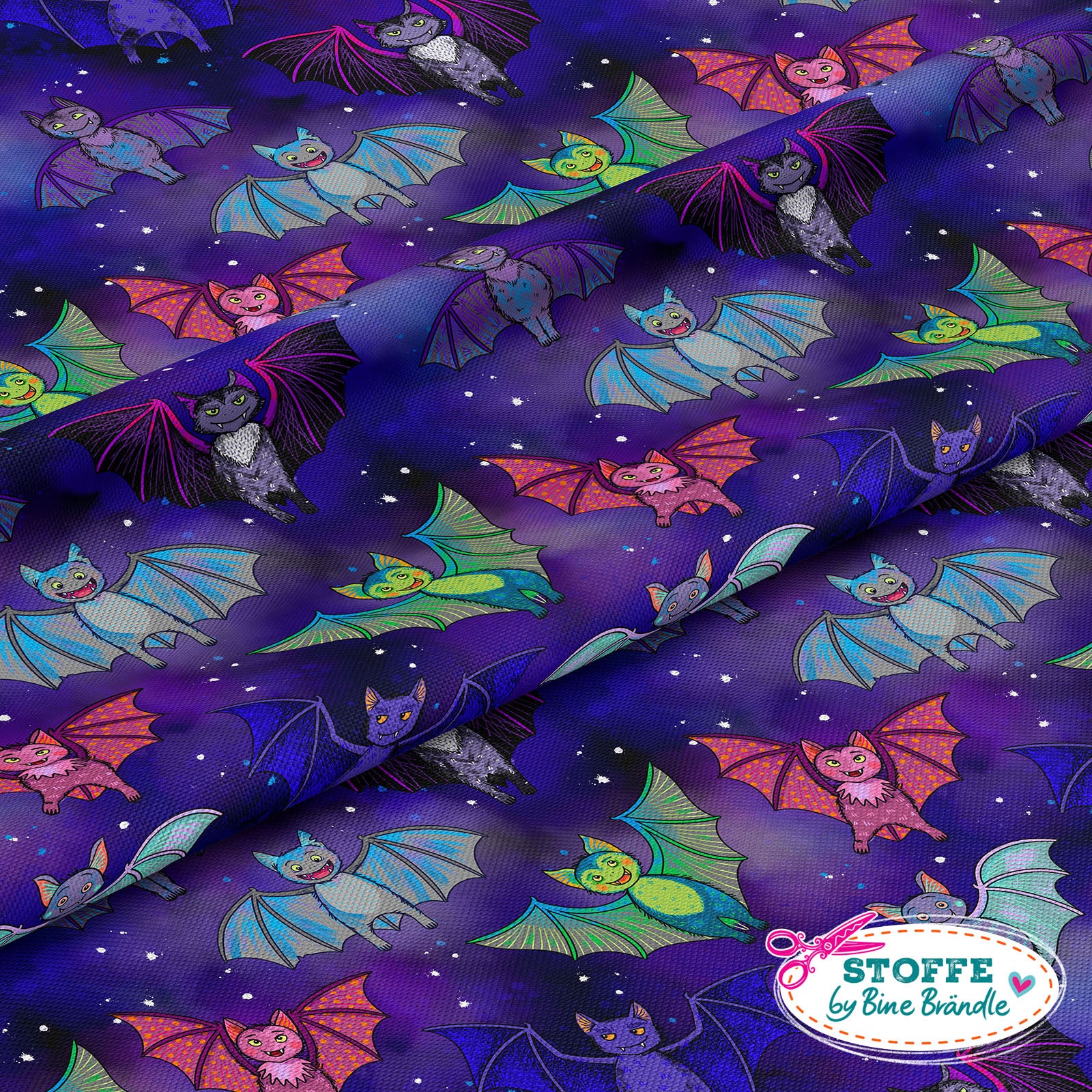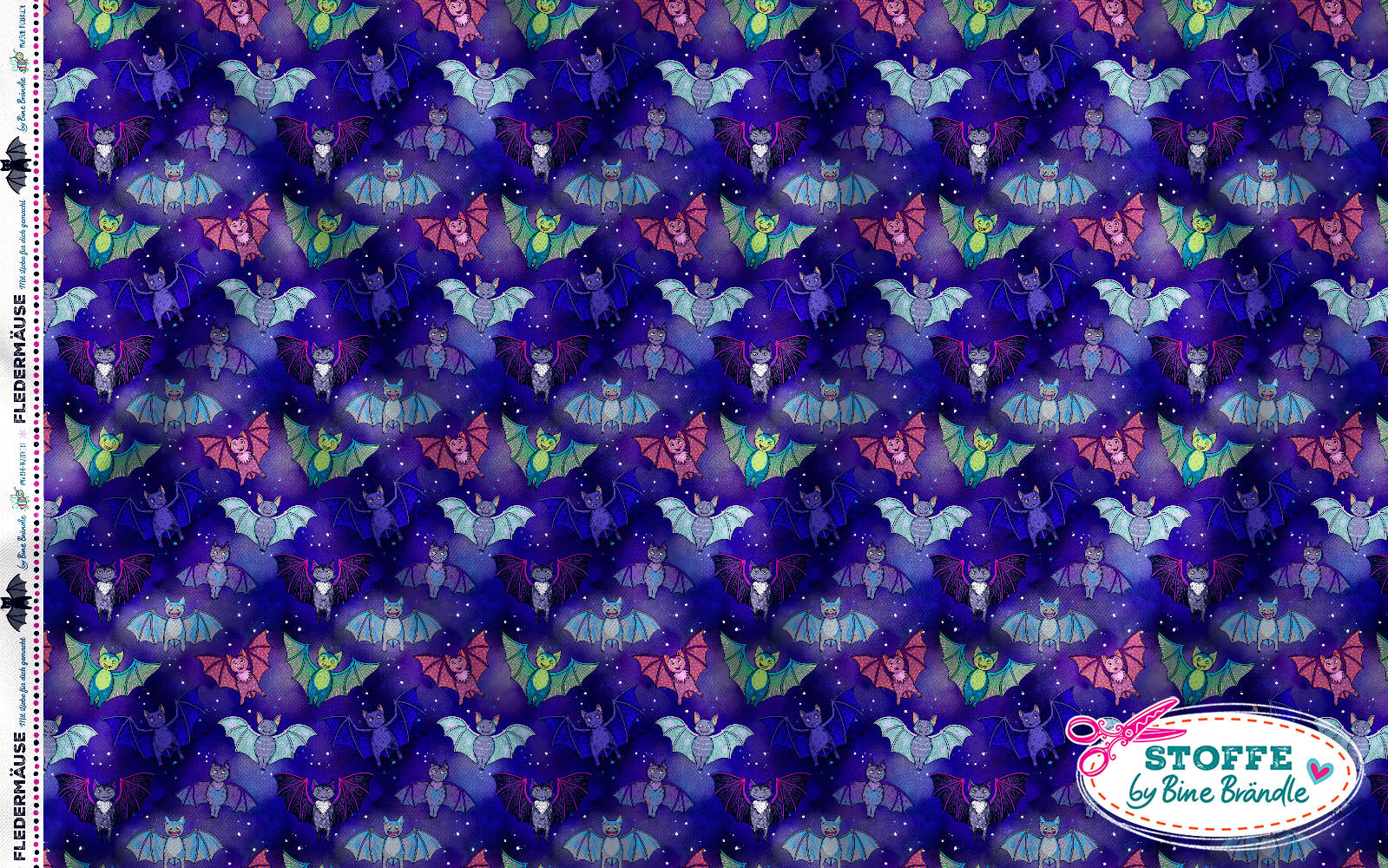 Farbenfroher Stoff mit dem Motiv "Fledermäuse klein".