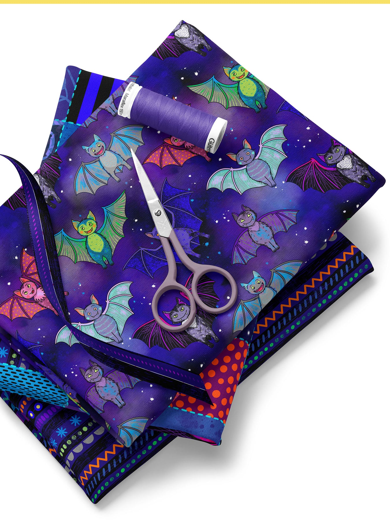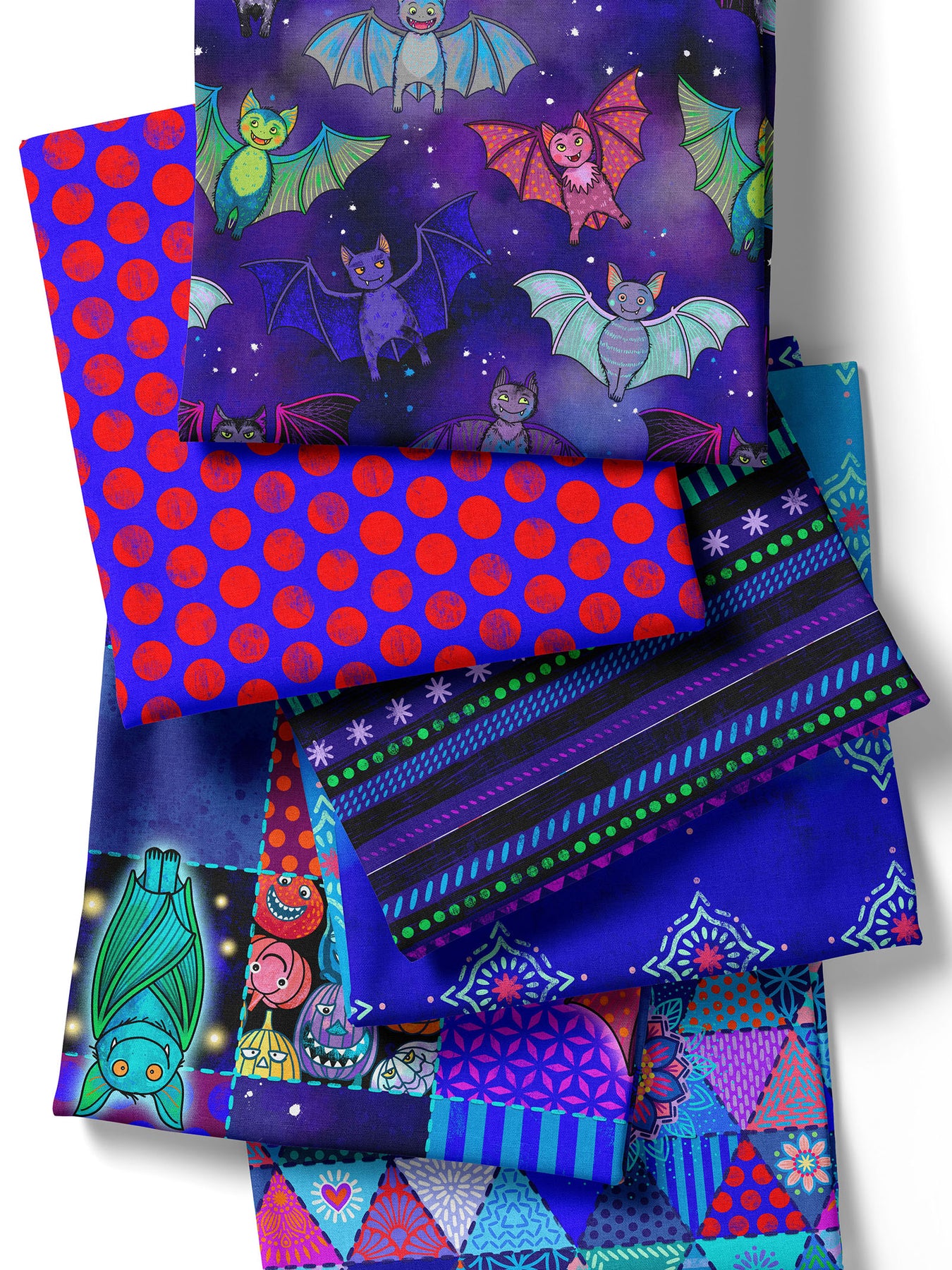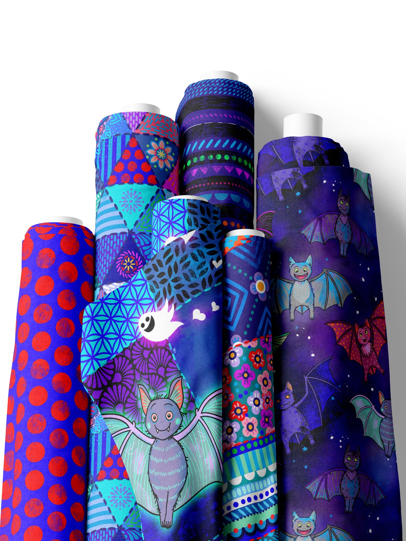 Farbenfroher Stoff mit dem Motiv "Fledermäuse klein".