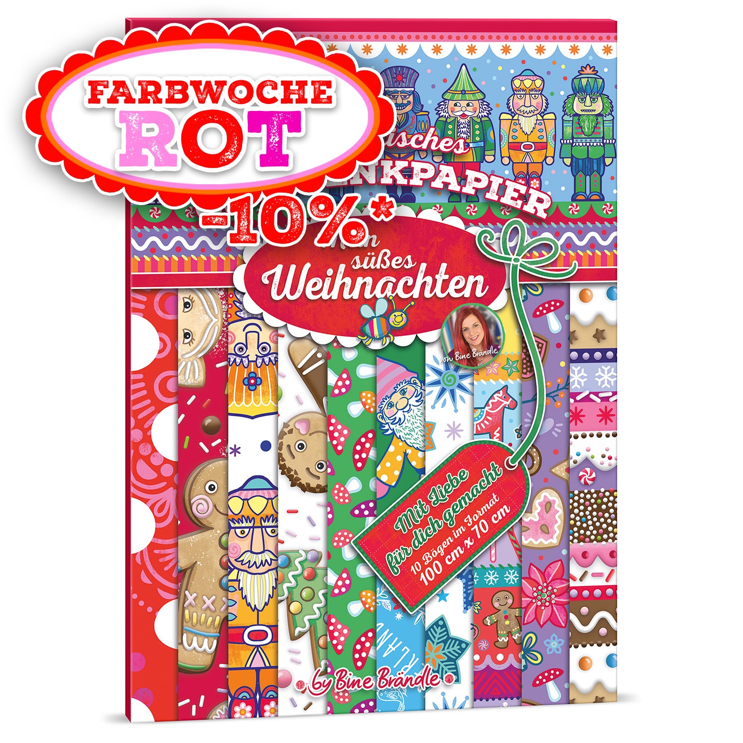 Die Mappe enthält 10 verschiedene Geschenkpapier-Bögen im Format 100 cm x 70 cm, einseitig bedruckt mit liebevoll gestalteten Motiven der Künstlerin Bine Brände.