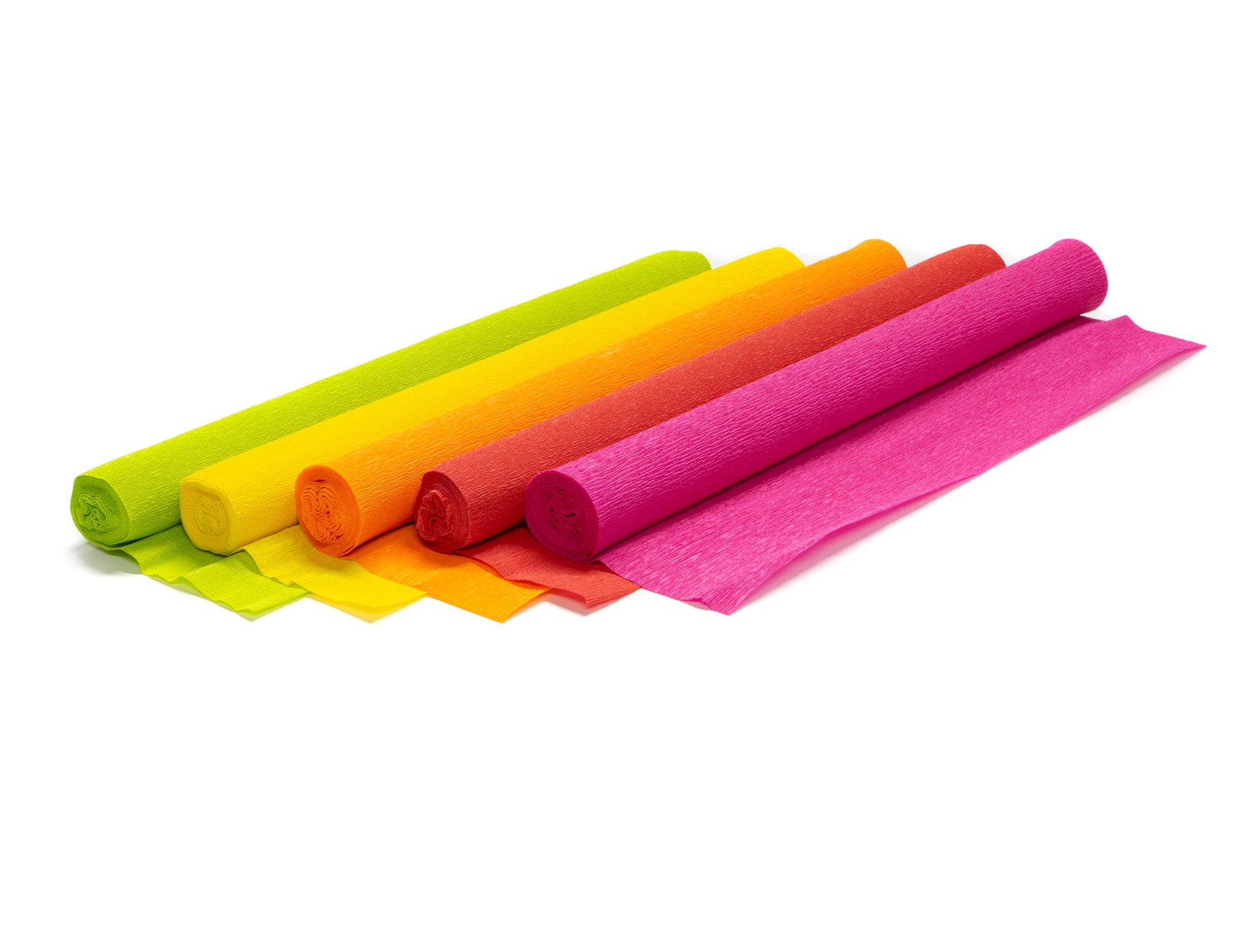 Das Set Mohnblume enthält 5 Rollen Floristenkrepppapier in den Farben Maigrün, Gelb,Orange, Pink und Rot.