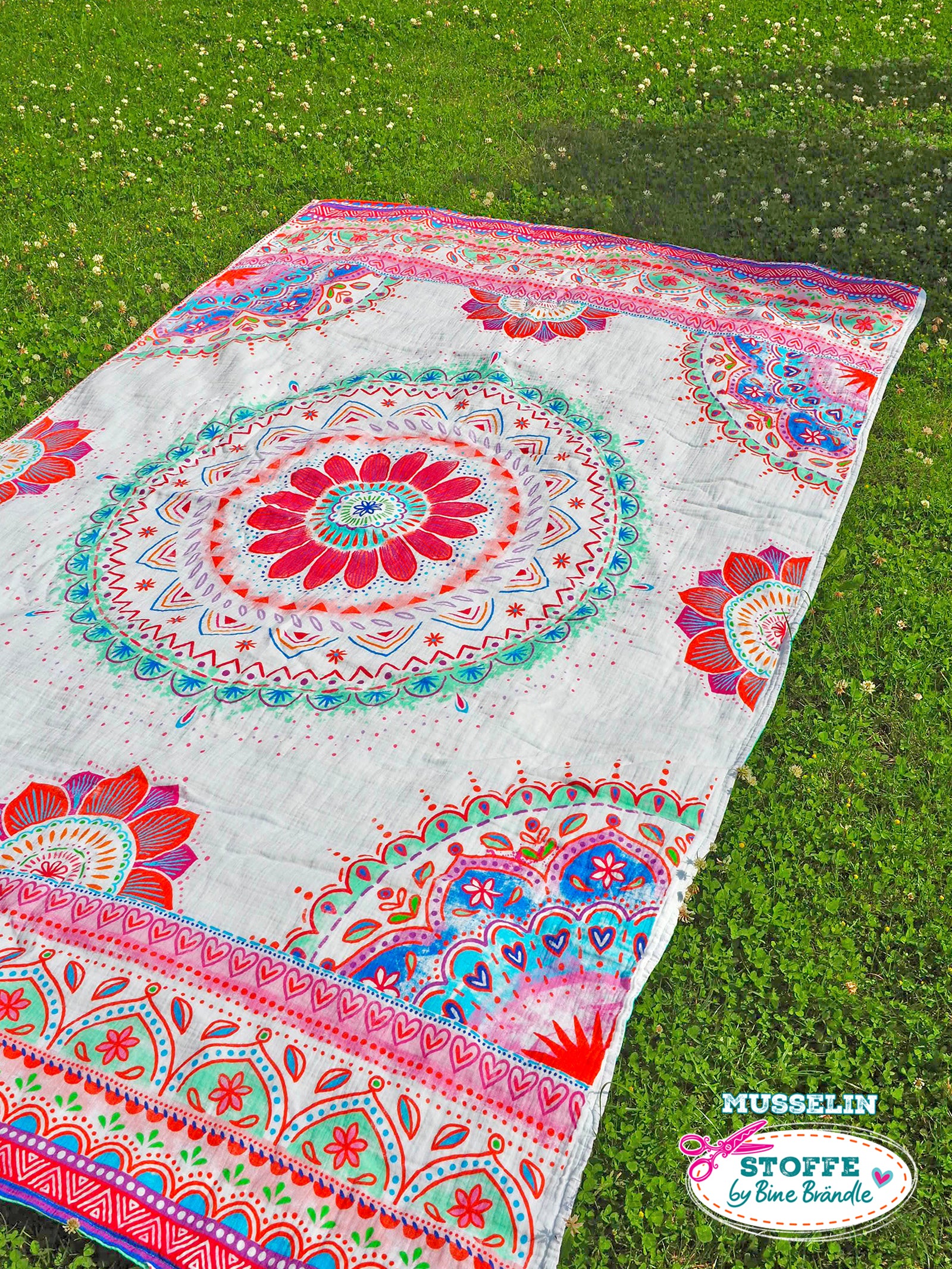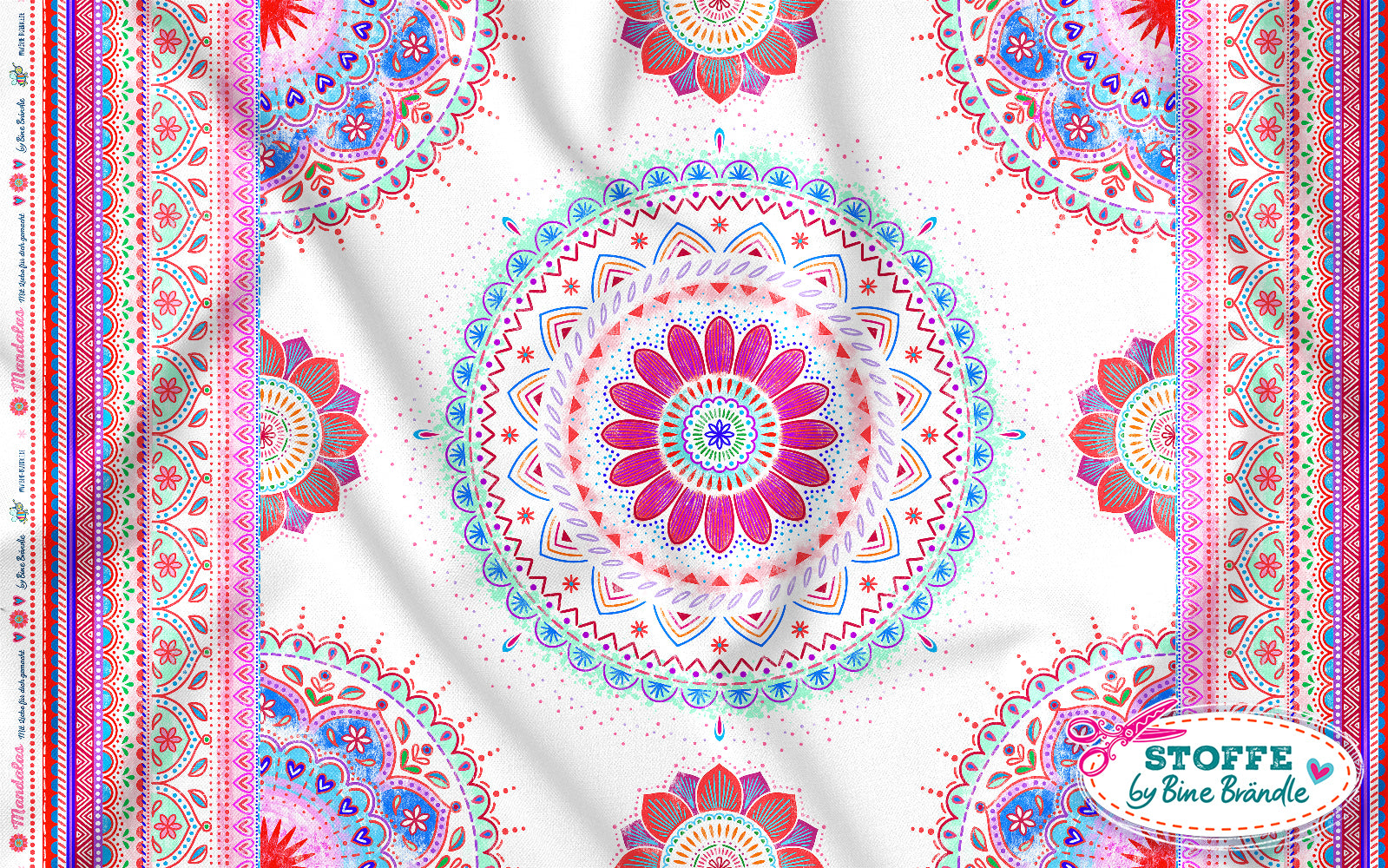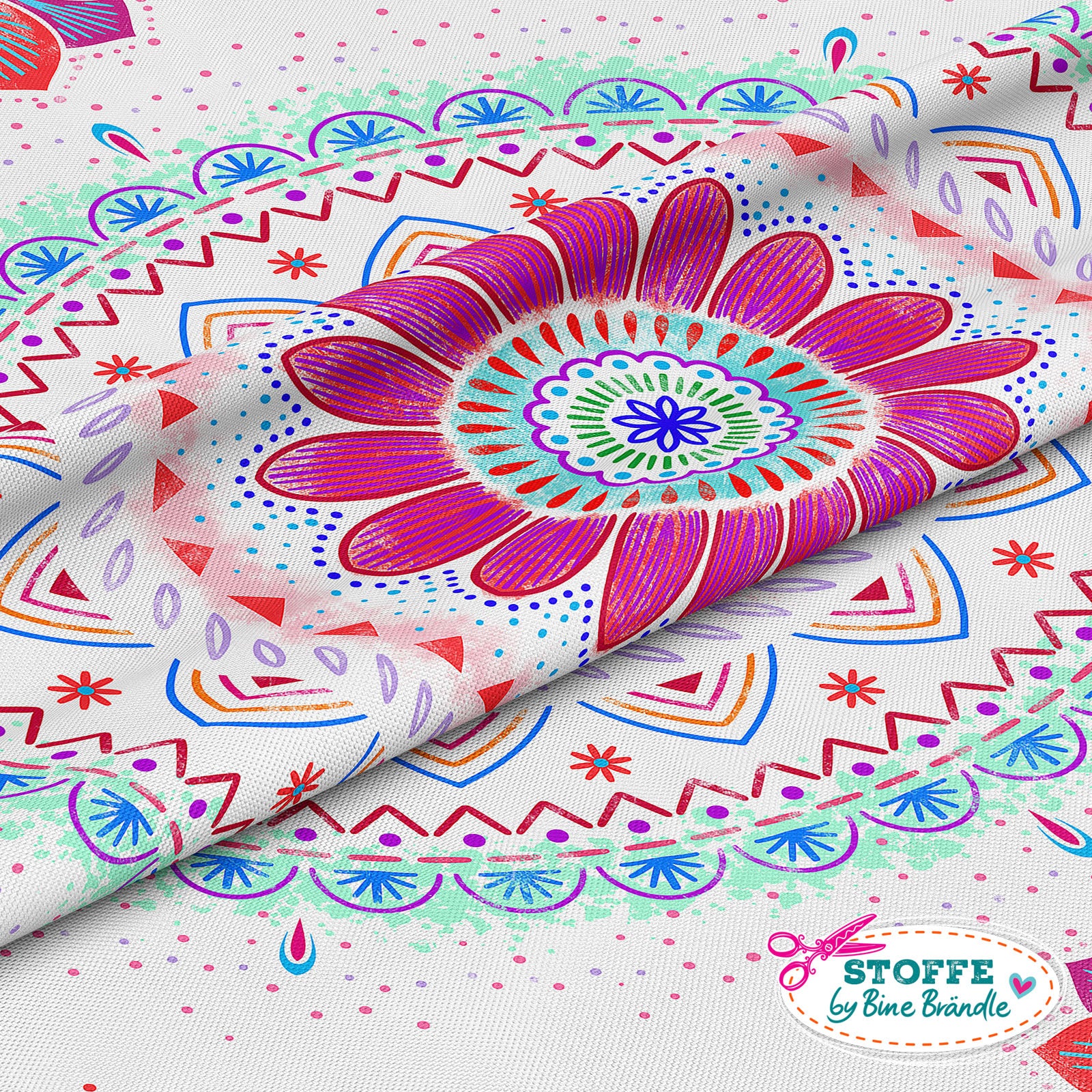 Farbenfroher Stoff mit dem Motiv "Mandala weiß-rot".