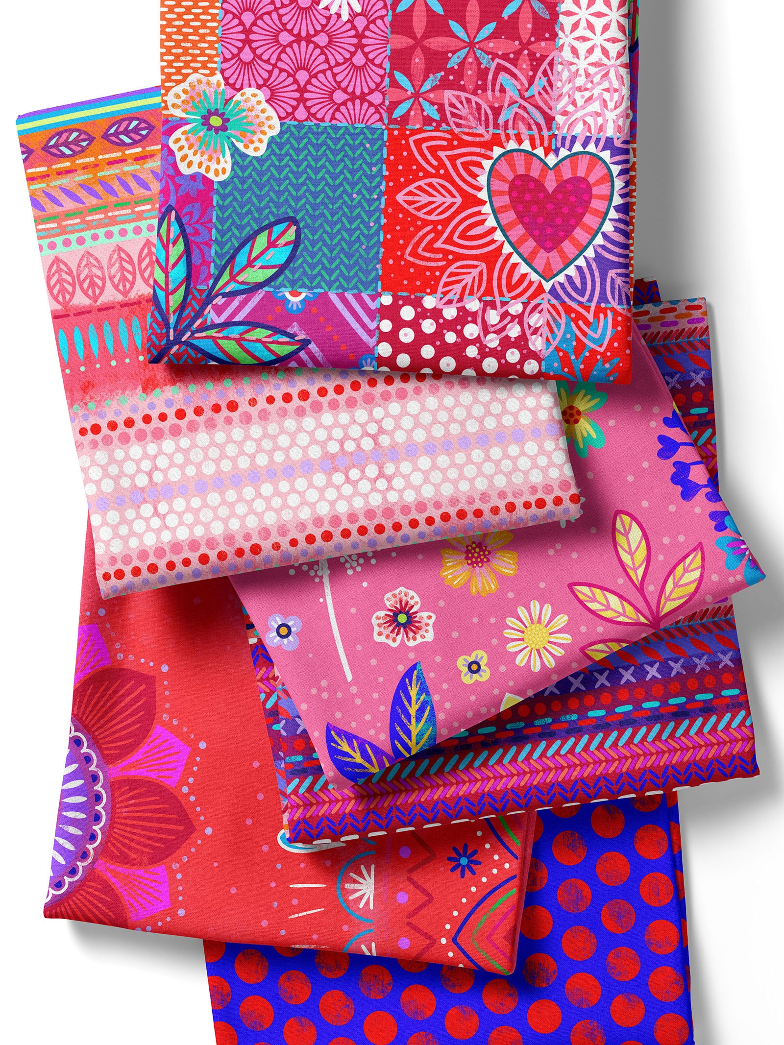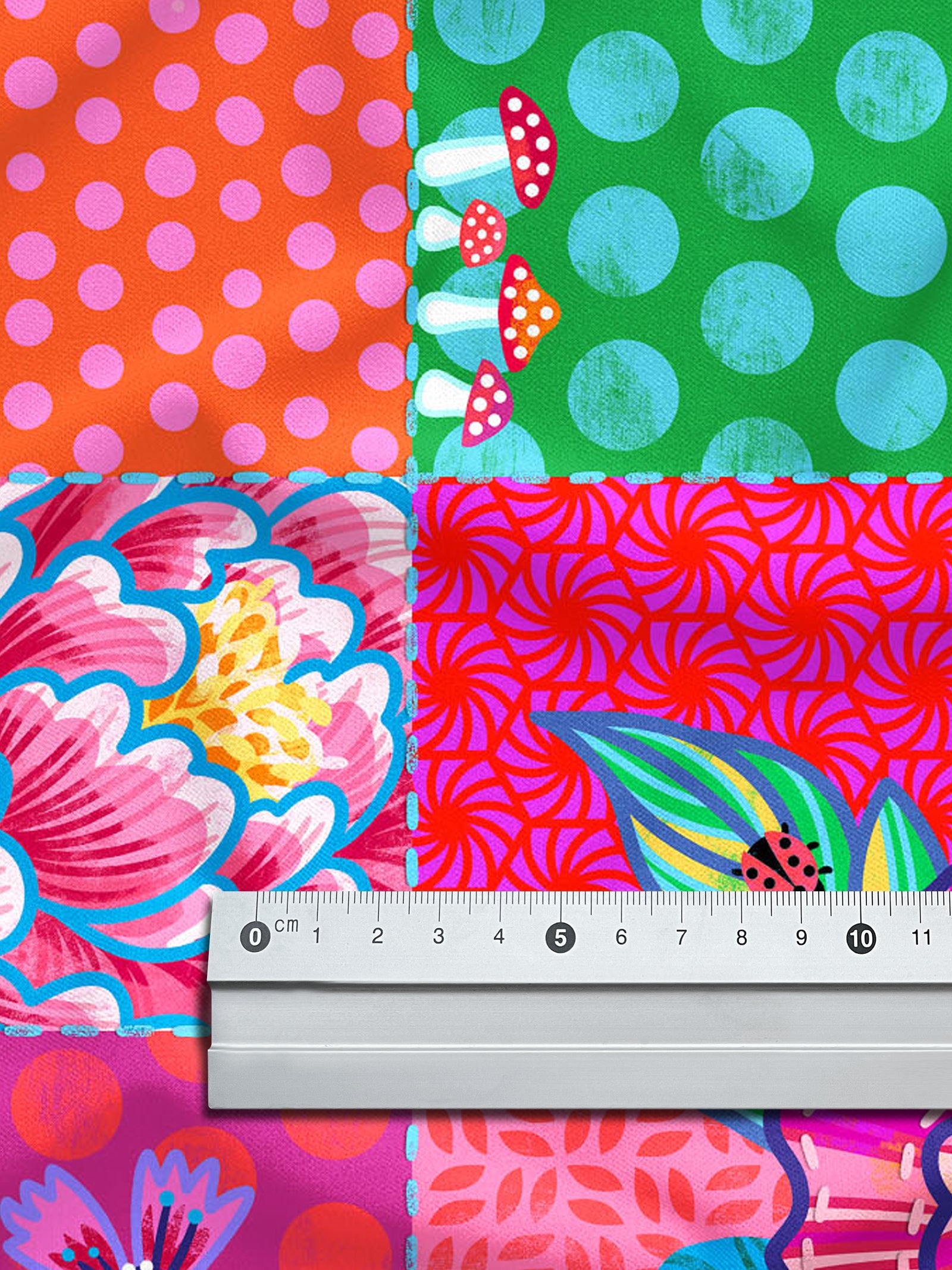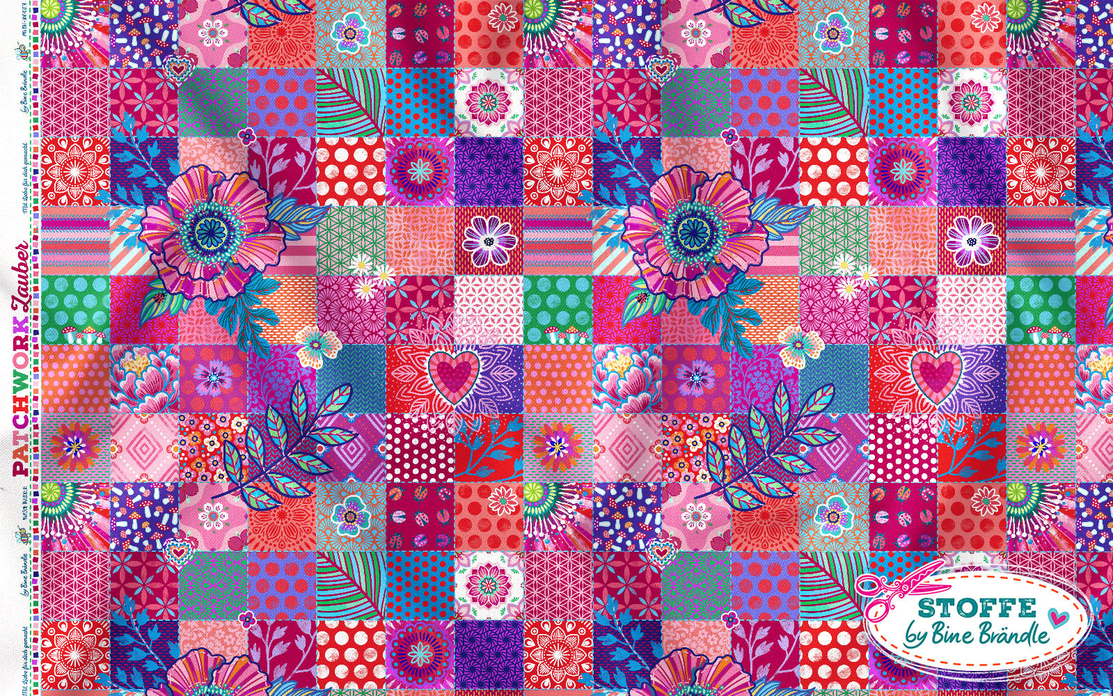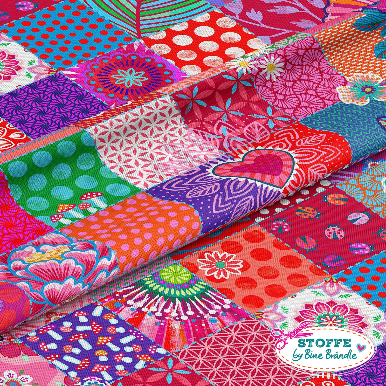 Farbenfroher Stoff mit dem Motiv "Patchwork Quadrate rot".