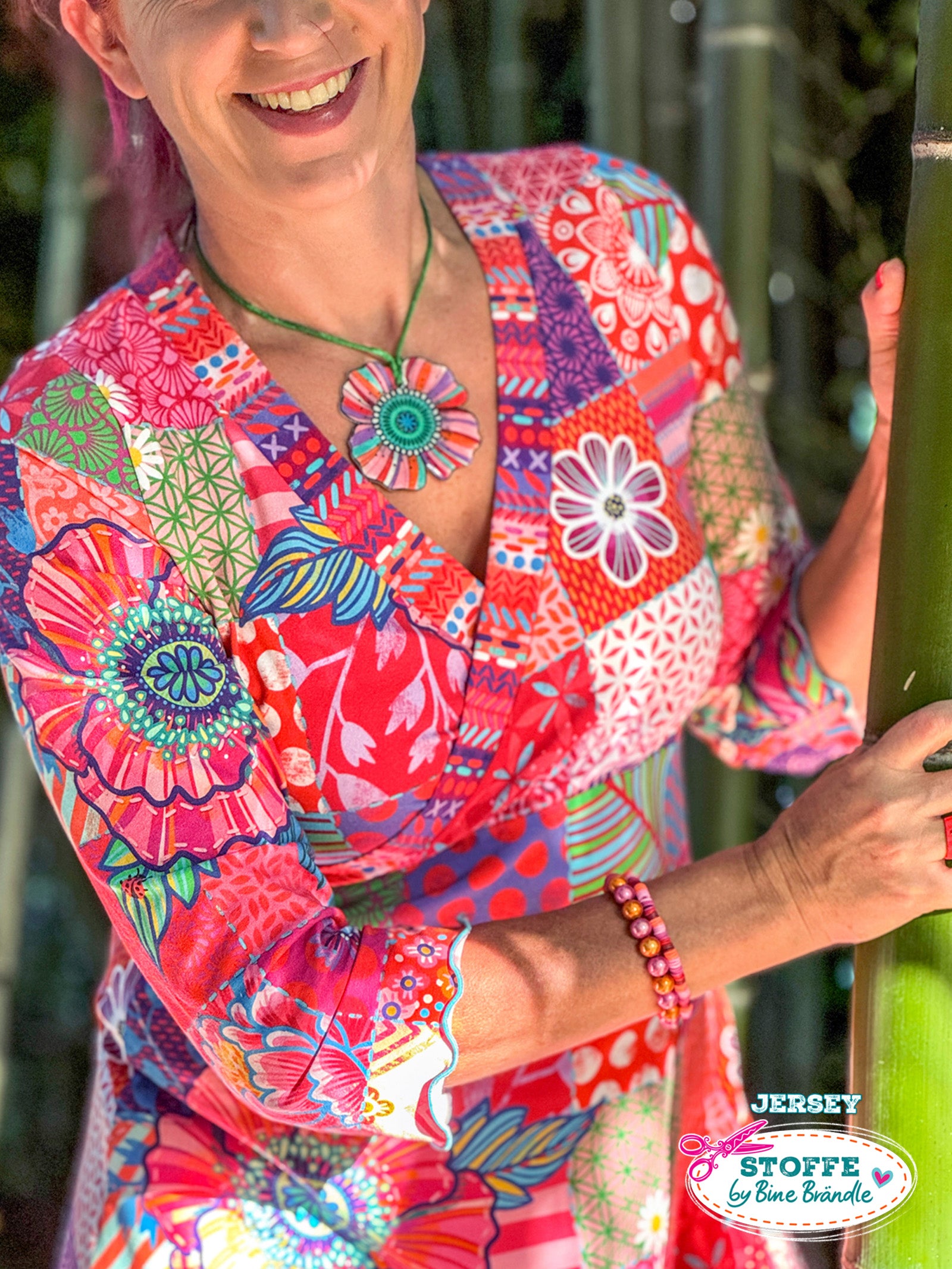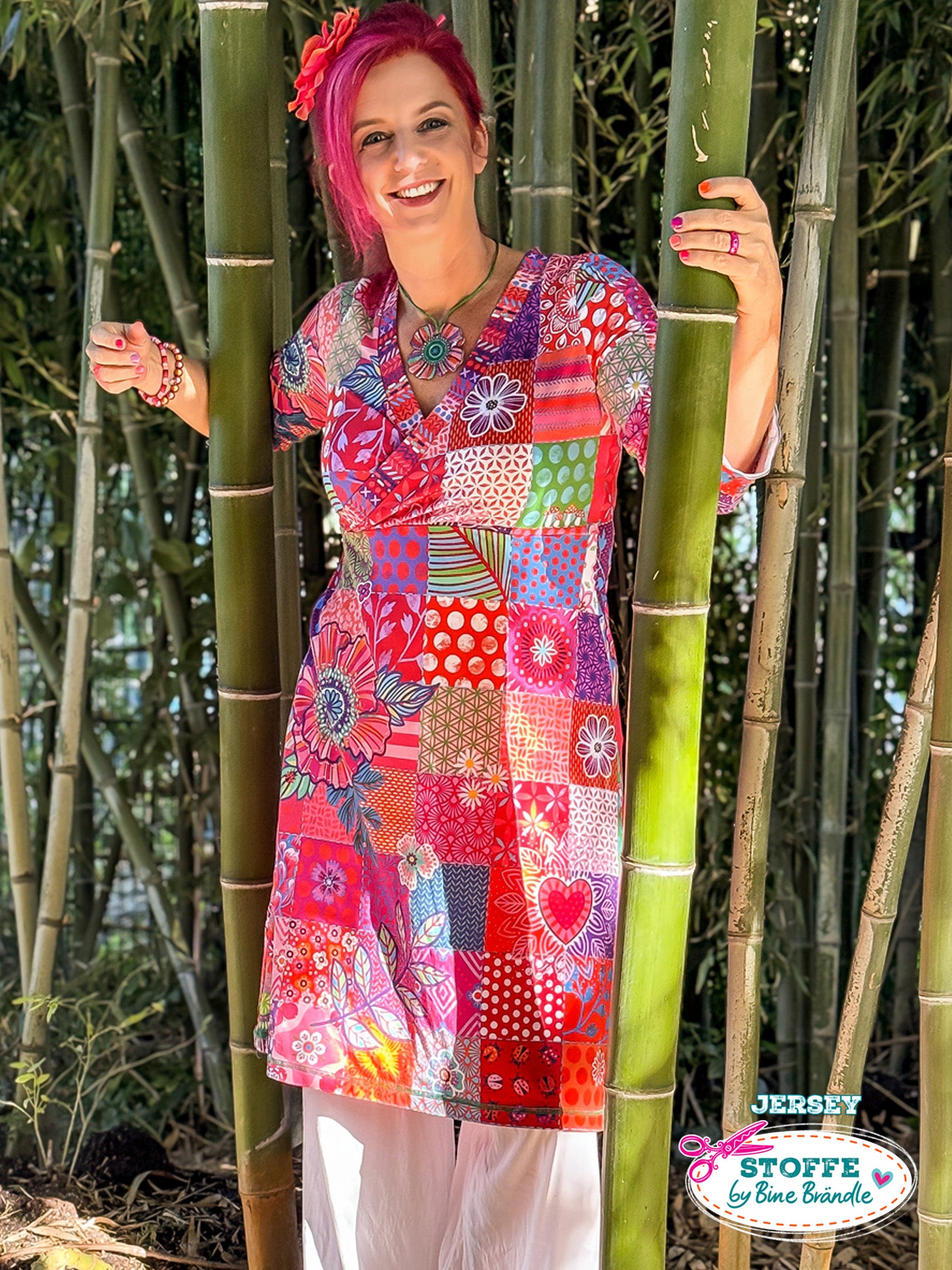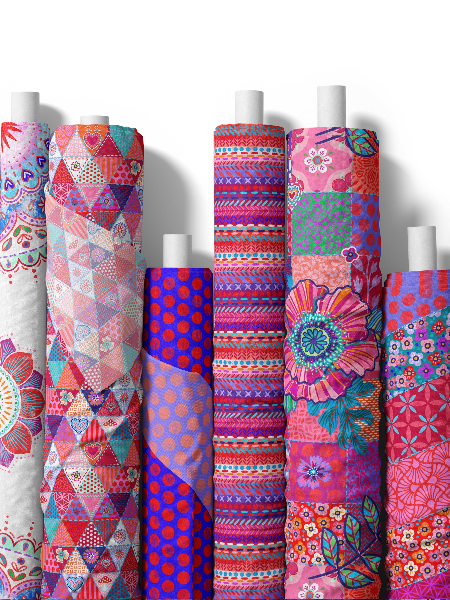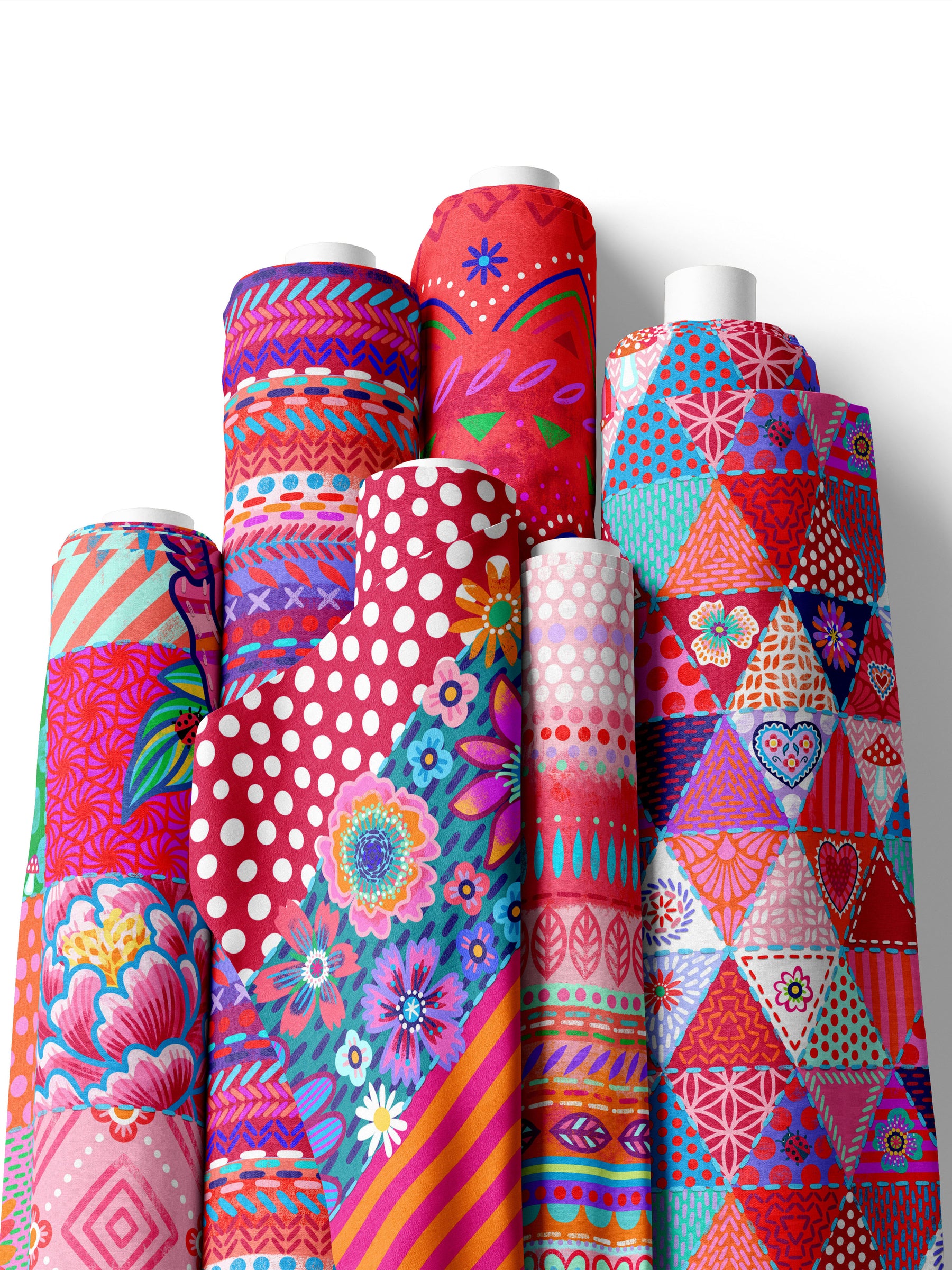 Farbenfroher Stoff mit dem Motiv "Patchwork Quadrate rot".